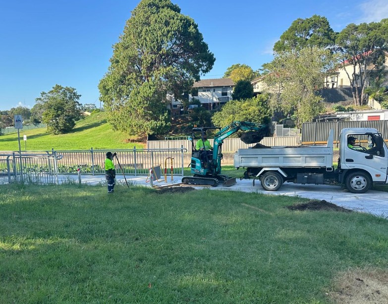 Preparing the site involved meticulous hole preparation, taking into account the existing path infrastructure and the necessity to work around various utilities. To ensure optimal planting depth and profile, we utilised a mini excavator to carefully excavate the tree pits. Following this, we positioned each tree, backfilled the holes, secured them with sturdy stakes, and applied a generous layer of mulch. This mulch serves to retain moisture and suppress competing weeds while allowing the trees to establish themselves effectively, setting the stage for a flourishing landscape that benefits the entire community.